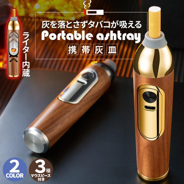 携帯灰皿 灰が落ちない ライター付き ポータブルアッシュトレイ マウスピース3種付き USB充電 持ち運び 車 ドライブ 野外 卓上 屋外 携帯 木 旅行 室内 車内 軽量 アウトドア 灰が落ちない