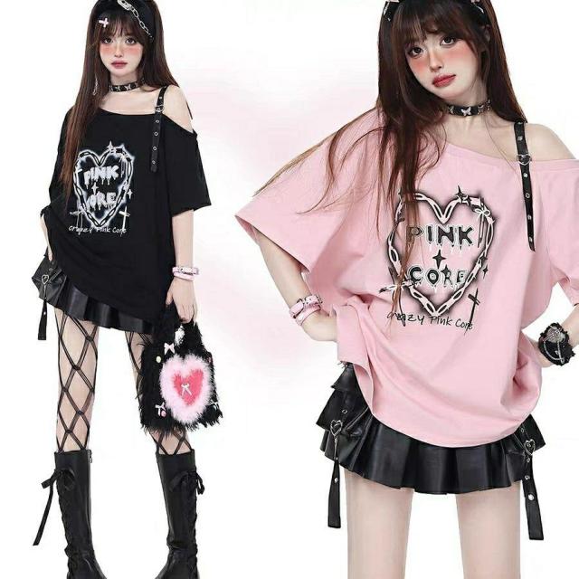 Tシャツ レディース ルーズ カットソー トップス 半袖 肩出し レースアップ ワンショルダー シャツ かわいい y2k 学生 ゴシック V系 地雷系 春夏服 韓国スタイル 20代 10代