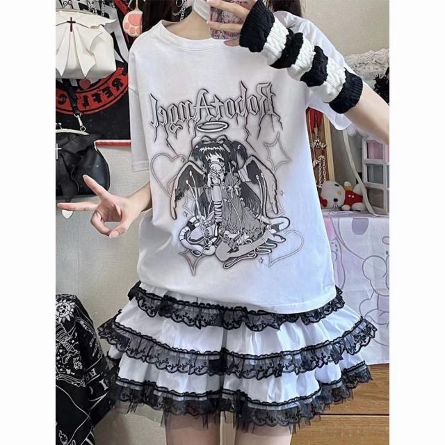 Tシャツ レディース ルーズ カットソー トップス 半袖 シャツ かわいい y2k 学生 ゴシック V系 地雷系 春夏服 韓国スタイル 20代 10代