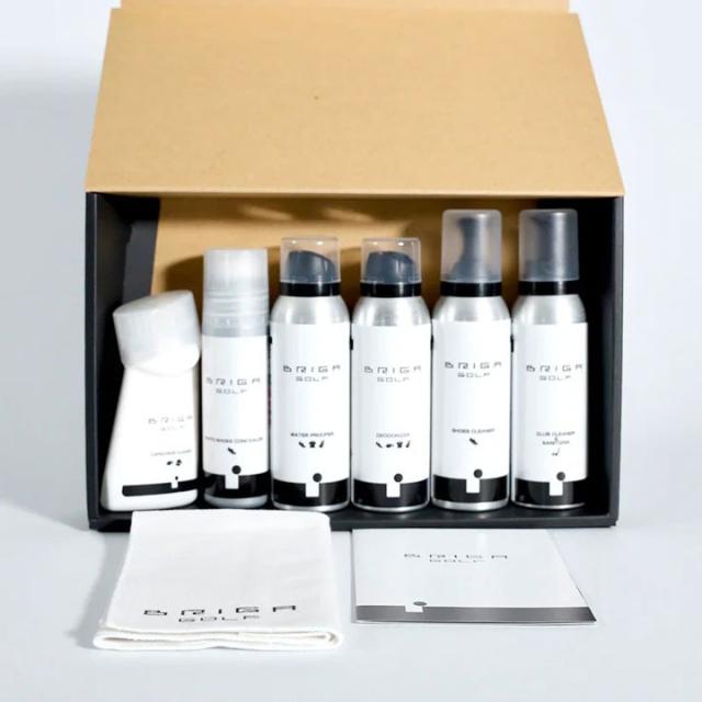 BRIGAGOLFのゴルフギアケア用品6 品と専用クロスのセット。ゴルフギアはお手入れを楽しみながら使う時代。
