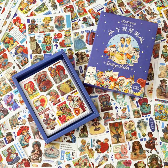 大容量 ◆50枚 シールシート 600ピース◆ レトロ 海外シール 箱入り 和紙 手帳シール フレークシール ステッカー 手帳デコ コラージュ 素材 アンティーク 海外ステッカー デコレーション マステシール 猫 犬 天使 熊 動物 女の子 植物 食べ物 人物 手帳 アレンジ