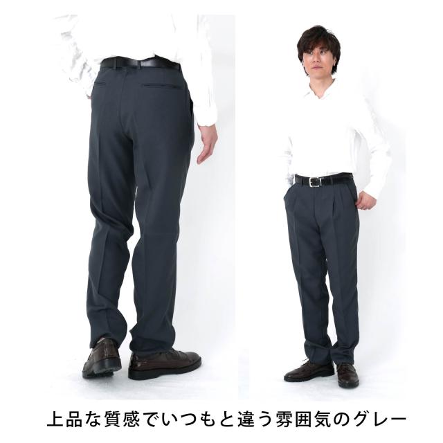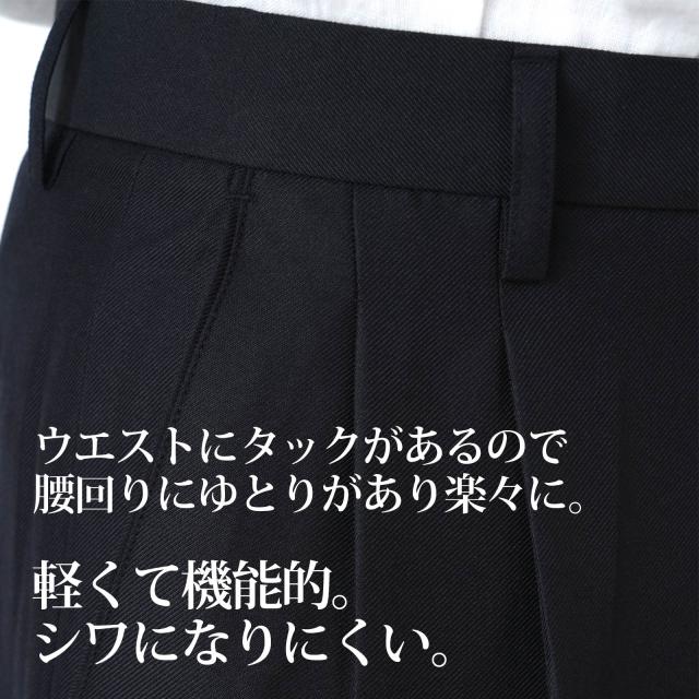 通年仕様のツータックビジネスパンツ ユニフォームに揃えて 家庭での洗濯もでき、いつでも清潔に 裾上げ加工できます