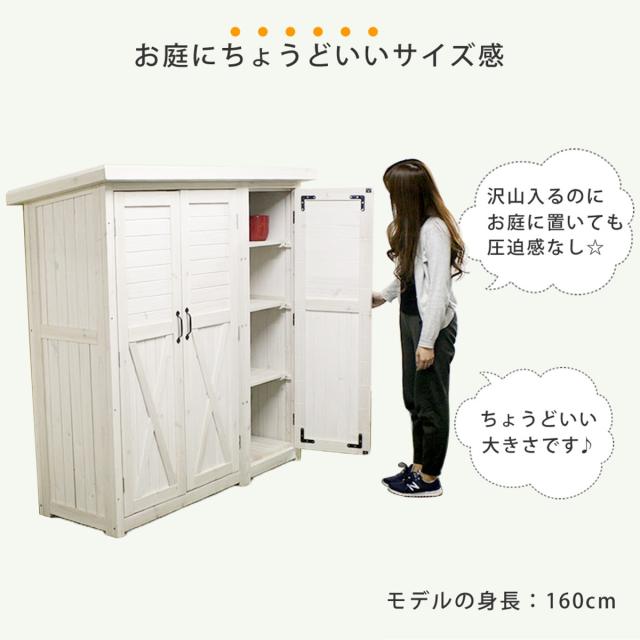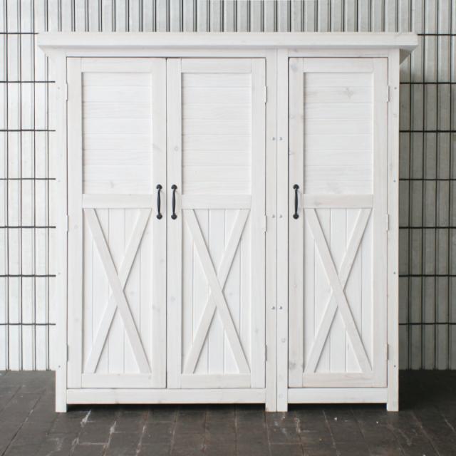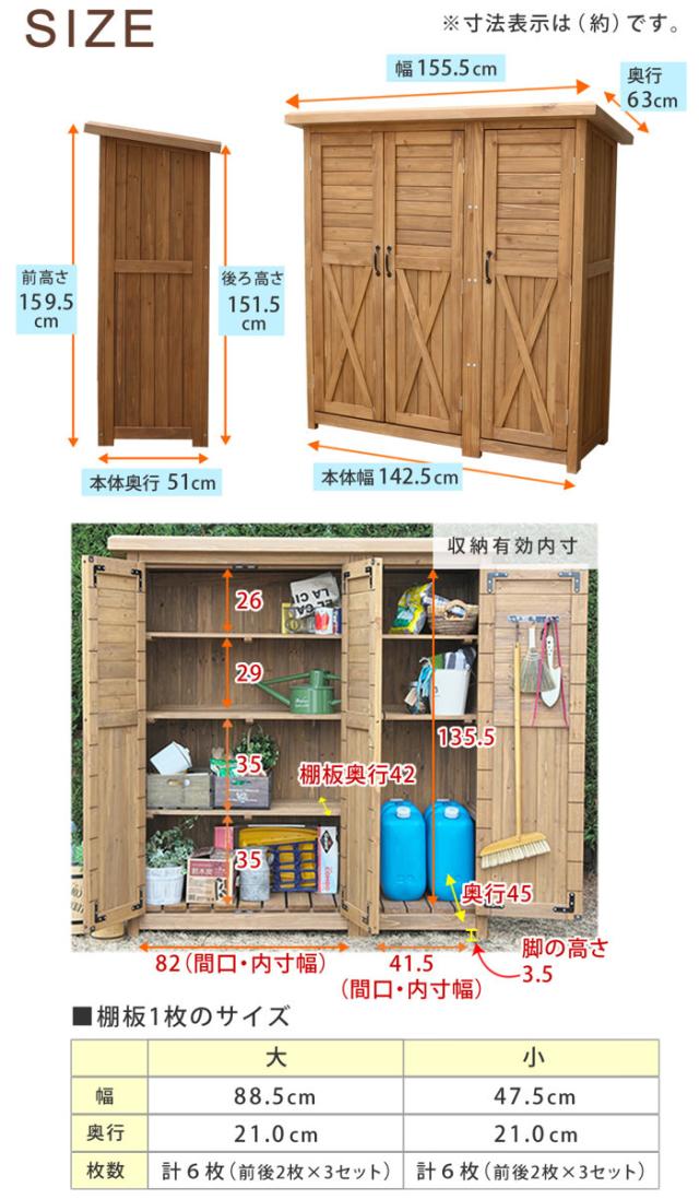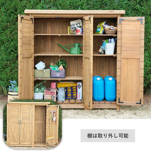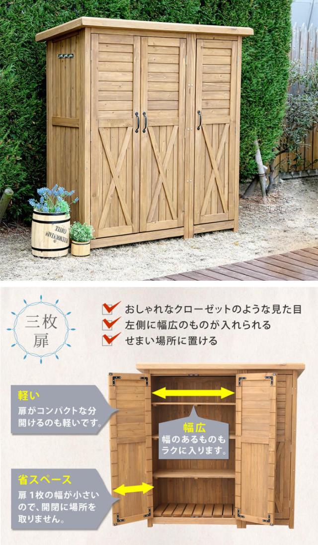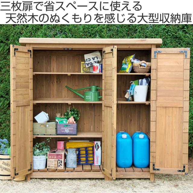 物置 木製 大型収納庫 三つ扉 ( 屋外 屋外物置 約 幅 155 cm 木製物置 ベランダ 物置き 屋外収納 収納 ラック おしゃれ 収納棚 天然木 ガーデン ガレージ 庭用品 マグネット扉 ストッカー ガーデンストッカー )