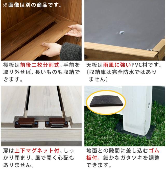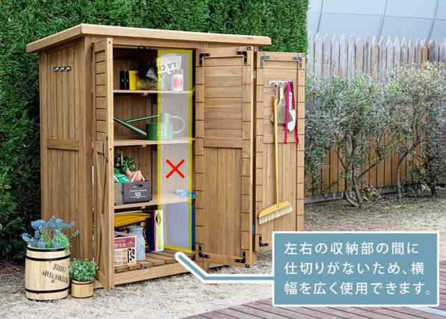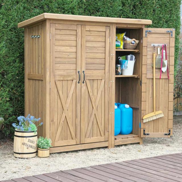 杉の木製の大型収納庫です。ナチュラルな自然素材の収納庫は、スチール製よりグリーンや植木に馴染みます。北欧風やカントリーテイストな雰囲気のお庭にも最適です。