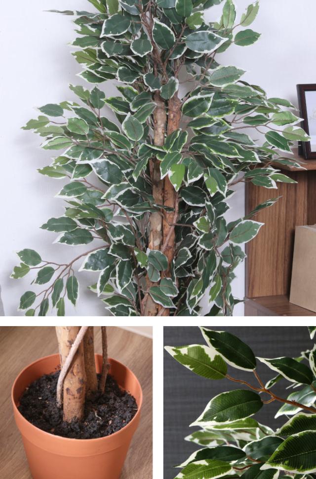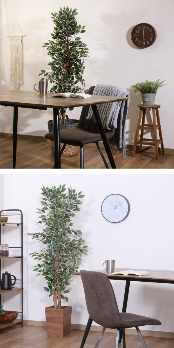 金運・家庭運に良いとされる丸い葉が特徴の、斑入りフィカスのフェイクグリーンです。本物そっくりの精密さで、インテリアに木の温もりを与えます。