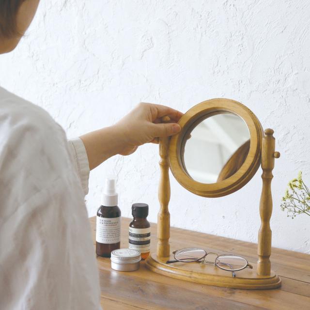 天然木のパイン材を使用した木製ならではの風合いが印象的です。デスクや玄関に置いて、毎日の身だしなみチェックにお使いいただけます。素朴で柔らかい雰囲気はインテリアとしてもどんなお部屋にも馴染みます。