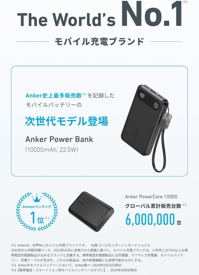 Anker史上最多となる全世界で600万台以上の販売を記録したモバイルバッテリーのベストセラー製品「Anker PowerCore 10000」の次世代モデル。【出力】【薄型設計】【搭載ポート】の3点で進化したモバイルバッテリーです。