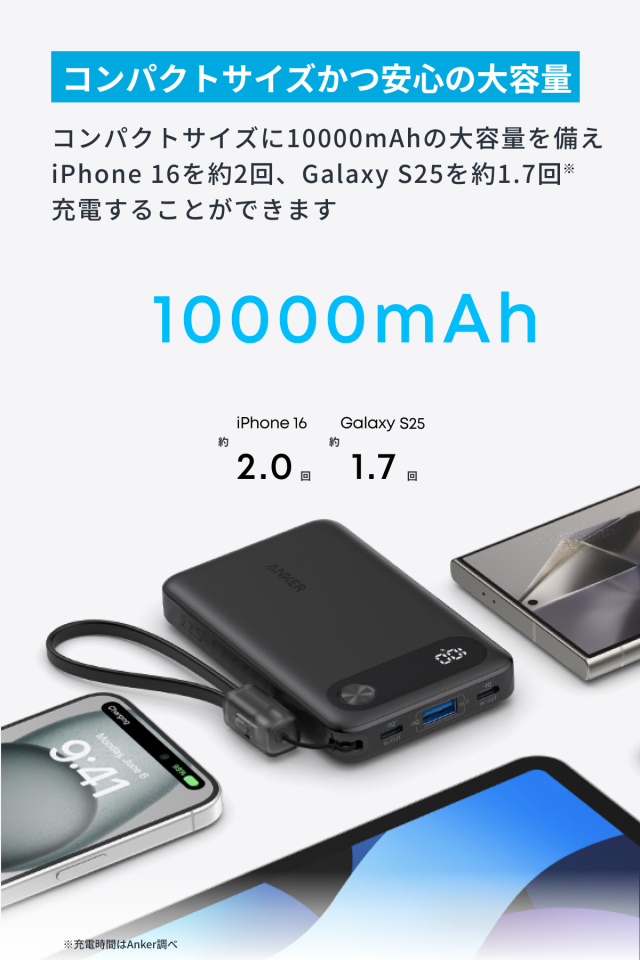 コンパクトサイズながら10000mAhの大容量で、iPhone 15を約2回、Galaxy S24を約1.8回充電することができます。