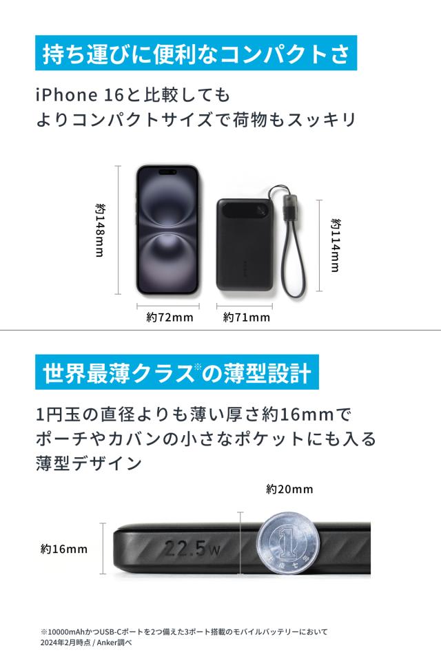1円玉の直径よりも薄い厚さ約16mmでポーチやカバンの小さなポケットにも入る薄型デザイン (※10000mAhかつUSB-Cポートを2つ備えた3ポート搭載のモバイルバッテリーにおいて、2024年2月時点 / Anker調べ) 。
