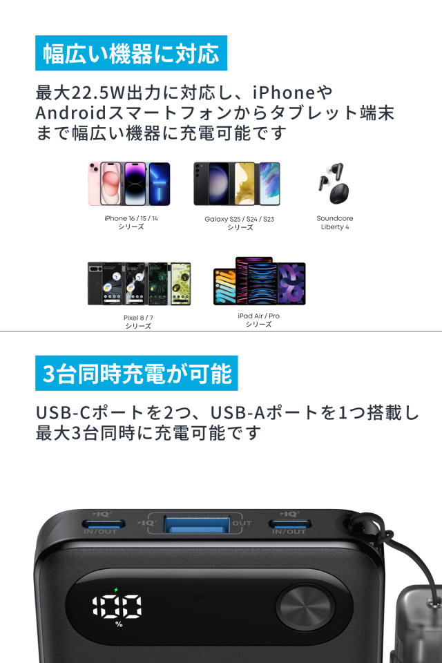 最大22.5W出力で、スマートフォンを含めた様々な機器に急速充電が可能です。さらに入出力可能なUSB-Cポートを2つ搭載し、USB-Aポートと合わせると3台の機器を同時に充電することができます。