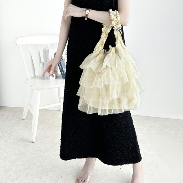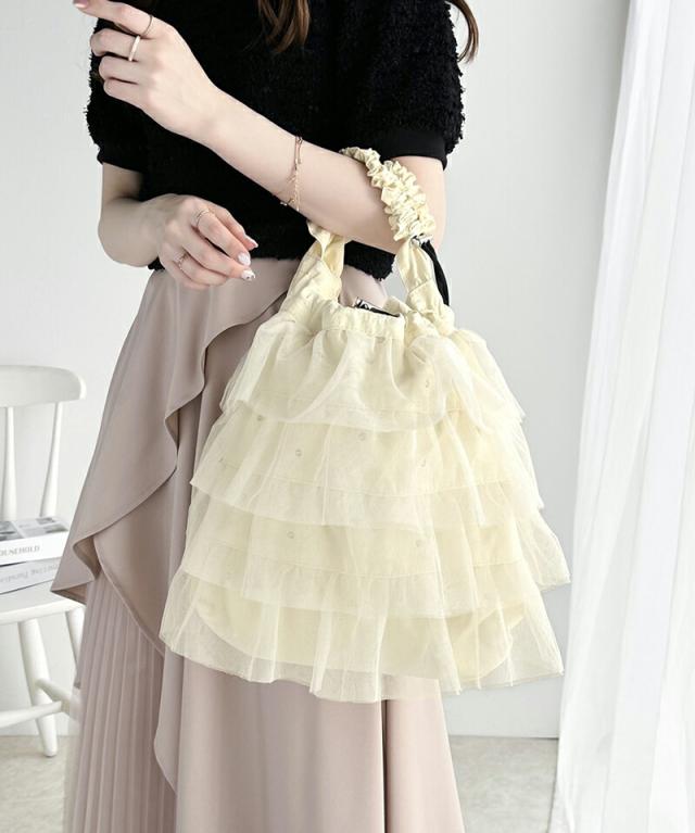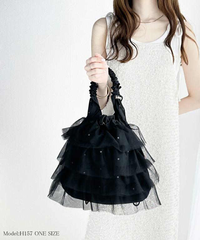 ★【mily bilet】即華やか見え。ラインストーン付きチュールフリルドロスト巾着バッグ★