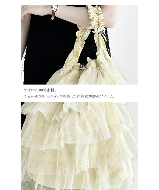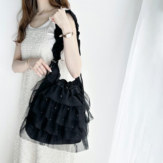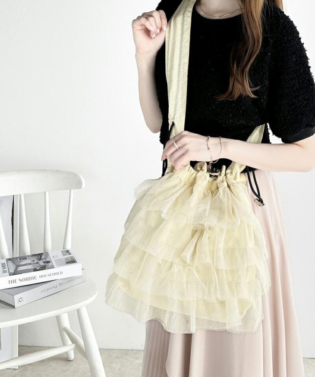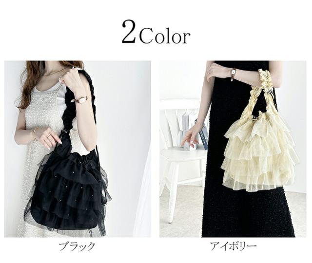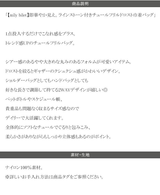 クラシカルエルフ冬新作 mily bilet バッグ ショルダーバッグ レディース きらきら ラインストーン 付き チュール フリル ハンドル 調節 可能ドロスト 巾着バッグ 背面 ジップ ポケット 内ポケット 大きいサイズ 2024ss mi1159020