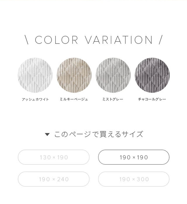 アッシュホワイト、ミルキーベージュ、ミストグレー、チャコールグレー