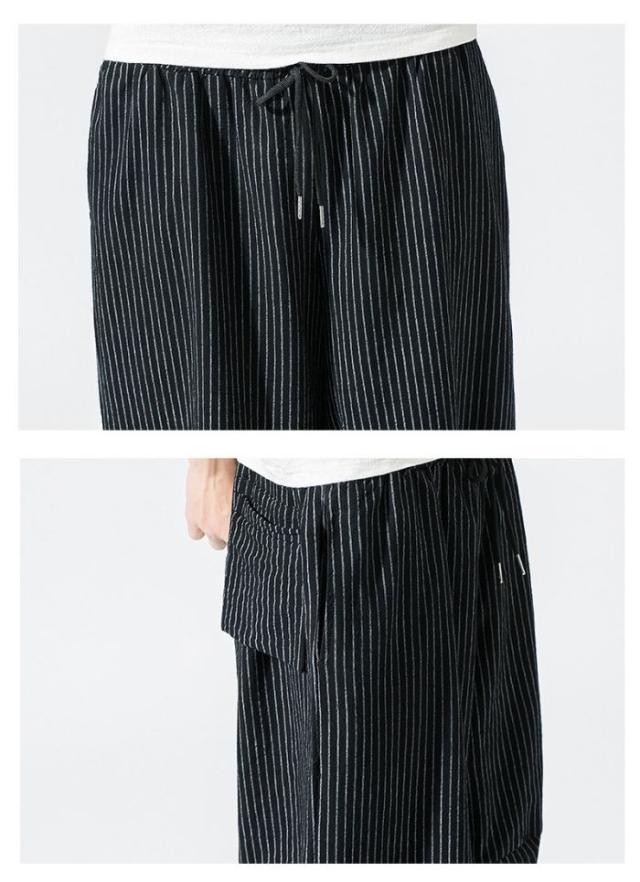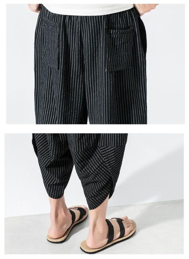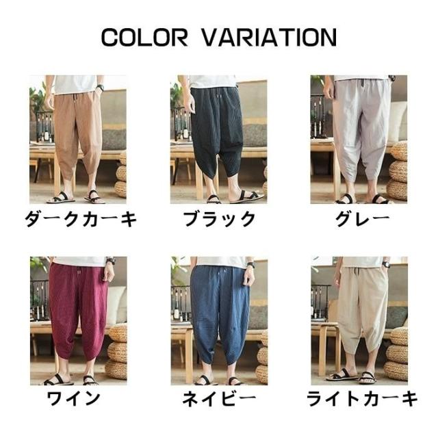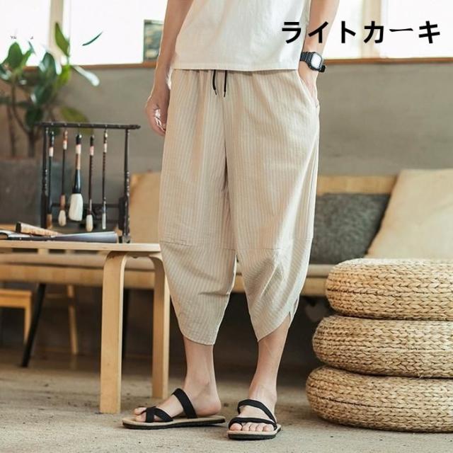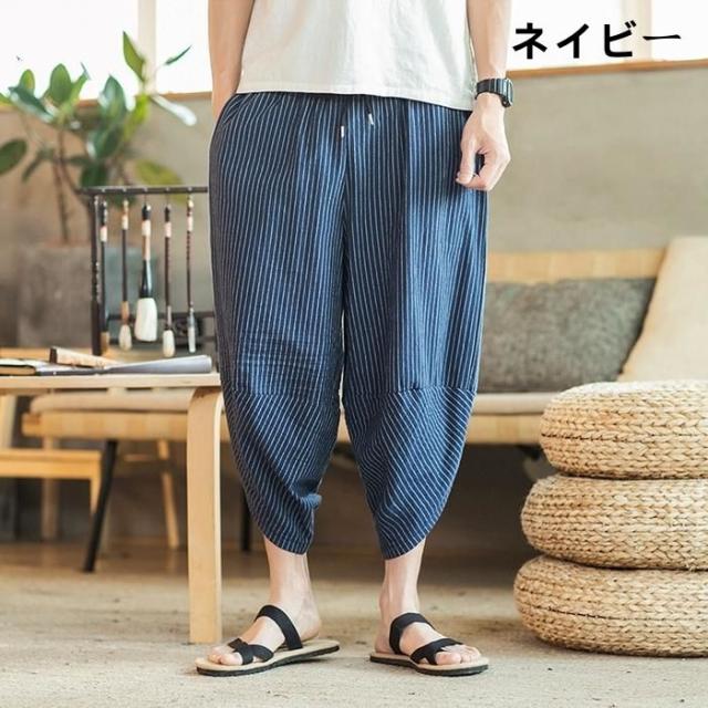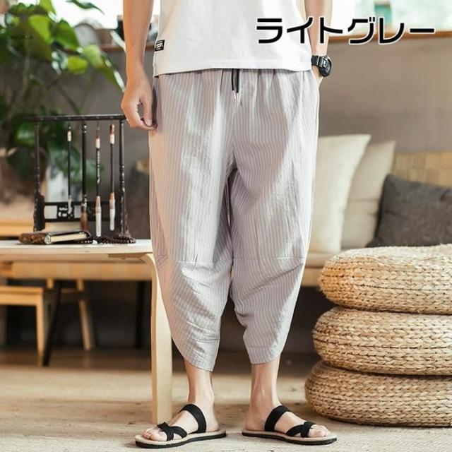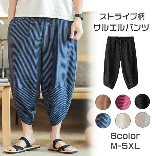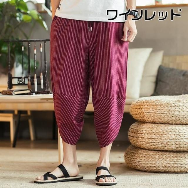 ワイドパンツ メンズ 綿麻風 サルエルパンツ 7分丈 ガウチョ ウエストゴム ストライプ カジュアル ゆったり 大きいサイズ 春夏