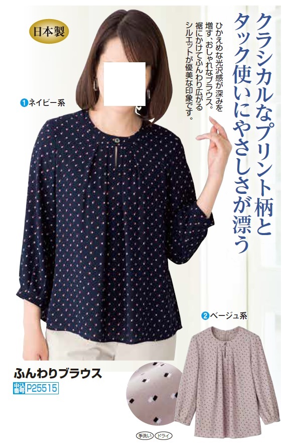 クルーネック ブラウス 七分袖 トップス レディース 日本製 ふんわりブラウス 全2色 婦人服 ミセス シニア 女性 ネイビー ベージュ 紺色 フレア レトロ 7分袖 シンプル シニアファッション 40代 50代 60代 70代 80代 母の日 お母さん 春夏 fuji p25515