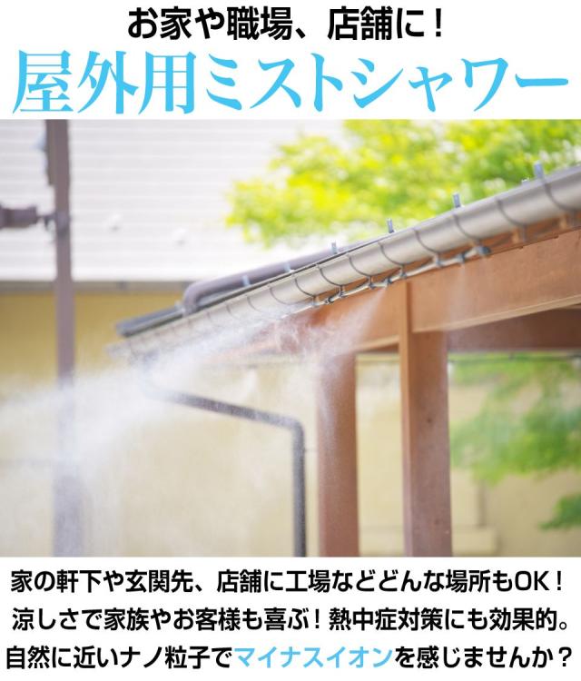 ・店舗やお家の庭、倉庫作業などにオススメの屋外用ミストシャワーです。 ・夏を涼しく快適に過ごすアイテムで近年注目されているナノミストであなたを涼しくします。 ・涼しさに誘われて、お客様も笑顔になること間違いなしです! ・ミストの加湿効果で、気温30℃の場合は約27℃に感じられます。 ・霧状のミスト散水によって気持ちよく熱中症対策ができます。 ・炎天下で作業している外仕事でも大活躍します。 ・蛇口にワンタッチで簡単設置!水栓工事は必要ありません。 |