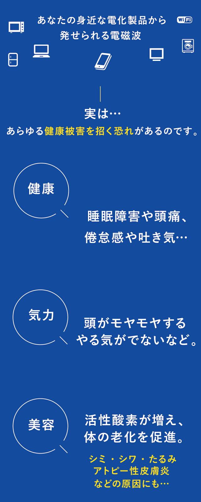 電子機器から発せられる電磁波の影響は至る所に潜んでいます。健康面や美容面、さらにはやる気などの気力にまで及ぶことも…