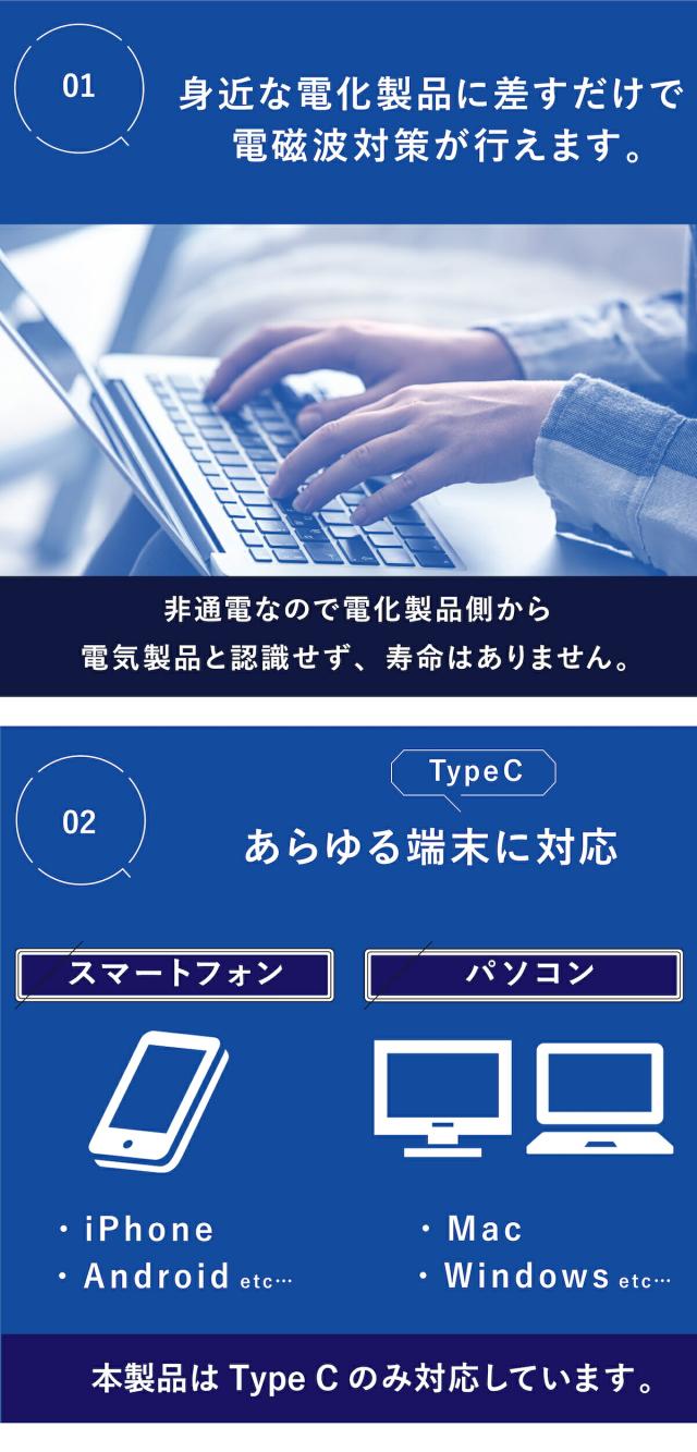 家電のUSB-C(type-C)端子につなぐだけで、ノイズを抑えて、電磁波の負担を軽減してくれます。さらにUSB充電器や変換プラグと組み合わせることで、寝室のコンセント対策に使ったり、日中のスマホやタブレットの対策に使ったり車の電磁波対策などに使うこともでき、その周囲が癒しの場になるよう働きかけます。