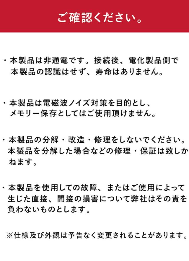 | お手入れ方法 | ・清掃する時は本製品を電化製品から外し行ってください。 ・シンナー・ベンジン等の有機溶剤で拭かないでください。 ・汚れは、乾いたきれいな布で拭いてください。 ・汚れがひどい場合は、きれいな布に中性洗剤を含ませ、かたくしぼってから拭いてください。 |