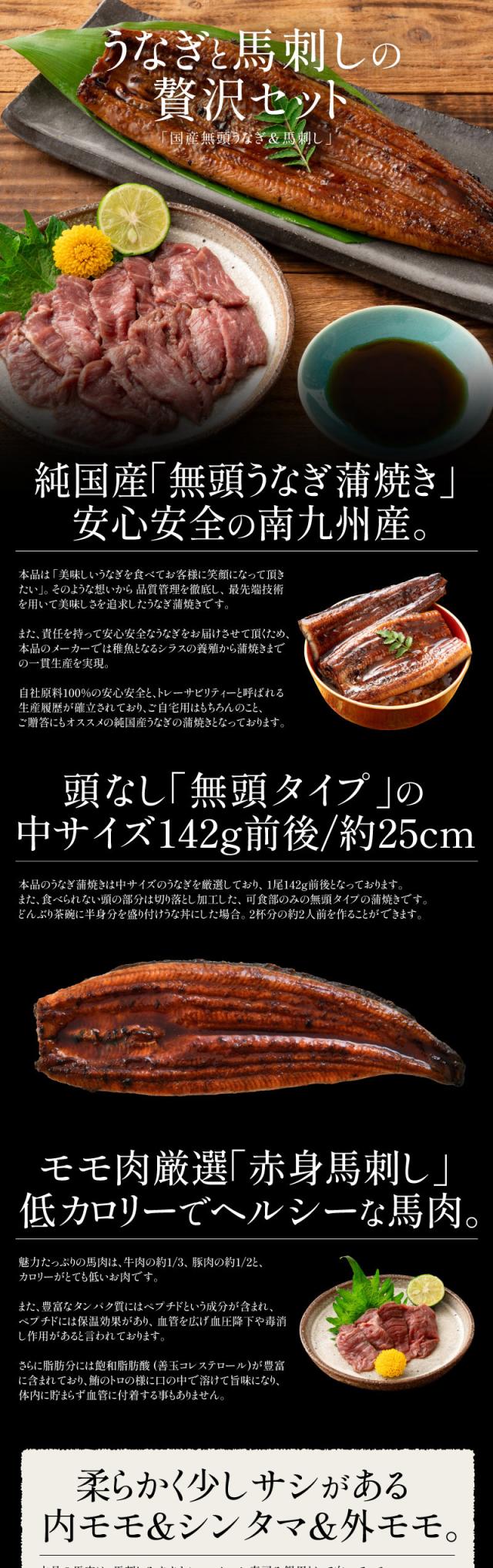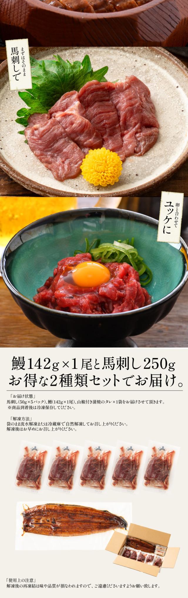 うなぎ蒲焼142g前後×1尾、蒲焼用(添付タレ、添付山椒 各1袋)、馬刺し50g×5パック