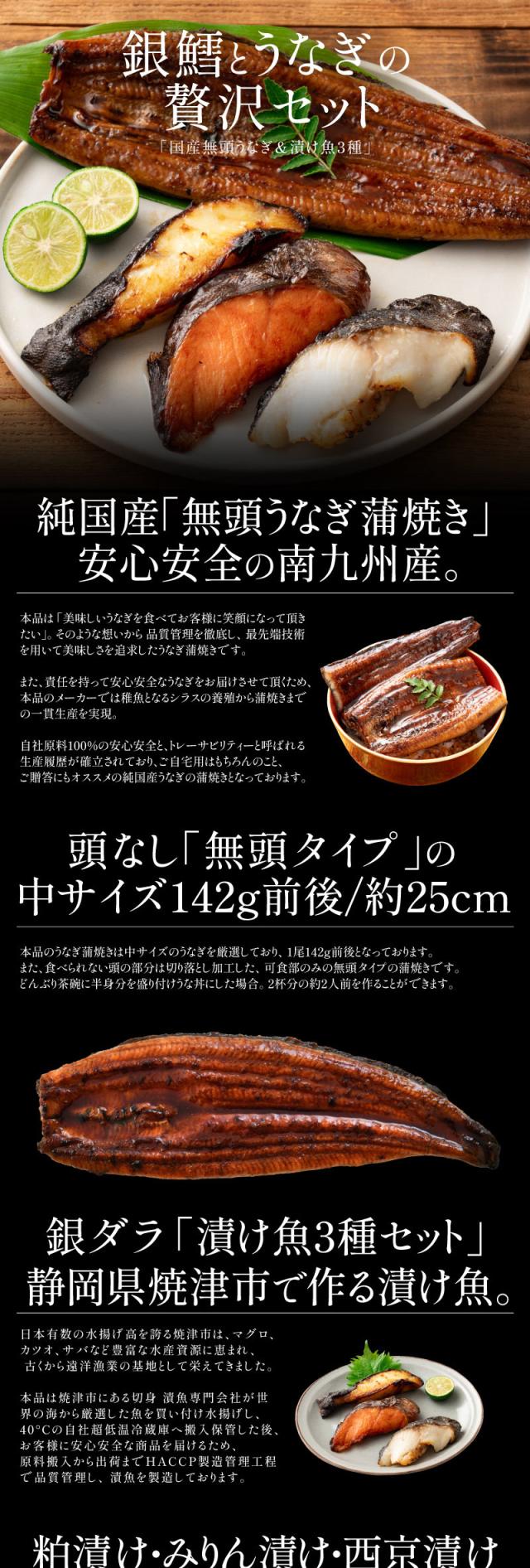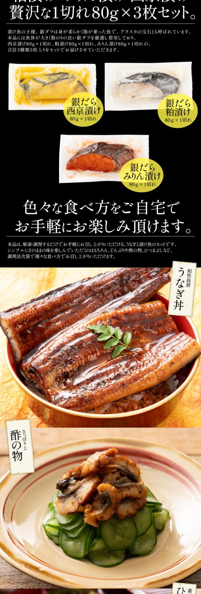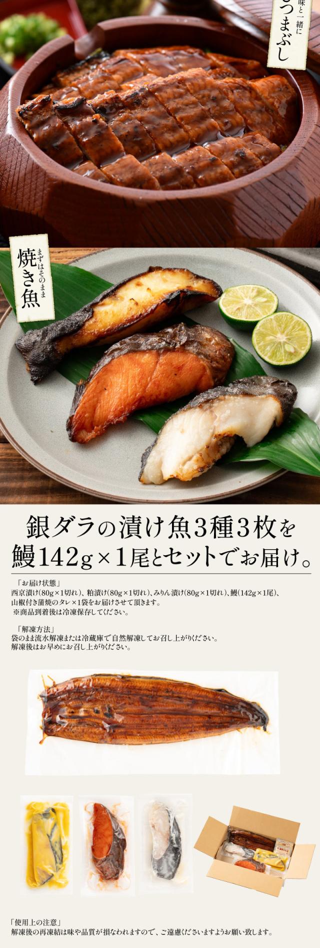 うなぎ蒲焼142g前後×1尾、蒲焼用(添付タレ、添付山椒 各1袋)、西京漬け80g×1切れ、 粕漬け80g×1切れ、みりん漬け80g×1切れ