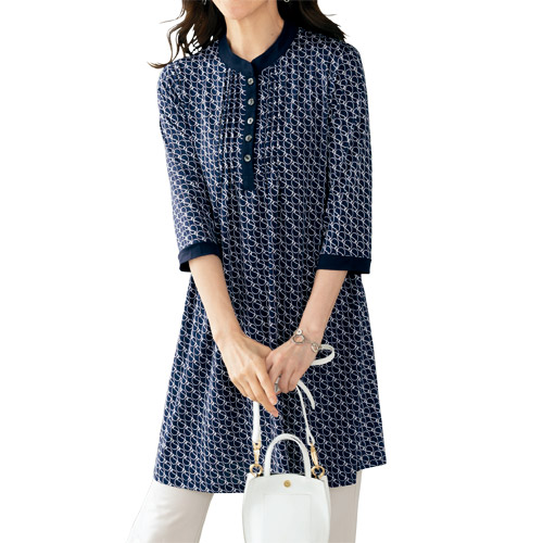 レトロモダンな柄のチュニックは、襟・前立てと袖口に無地を切り替えて引き締め見えを意識。