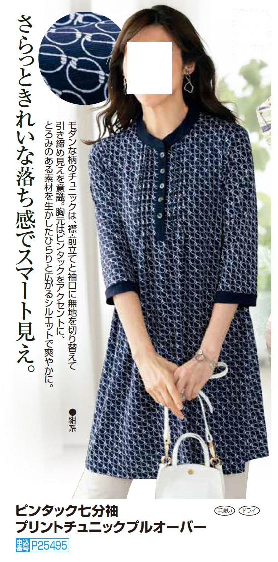 ピンタック七分袖プリントチュニックプルオーバー ネイビー チュニック 紺色 レトロ柄 レディース 婦人服 ミセス シニア 女性 クラシカル 上品 ノーカラー スカーフ風柄 シニアファッション 40代 50代 60代 70代 80代 母の日 お母さん 春夏 nss p25495
