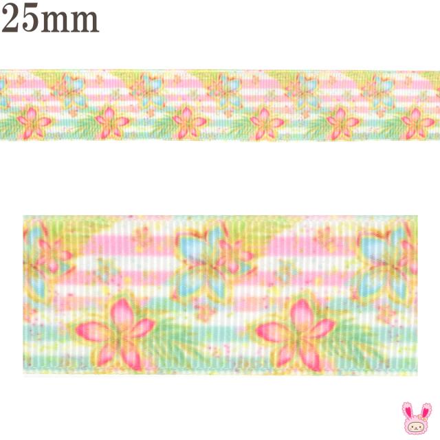 プリントリボン 南国風2色のお花とボーダーリボン 幅25mm 1m単位 切り売り (3m以上) [NEW SALE価格]★