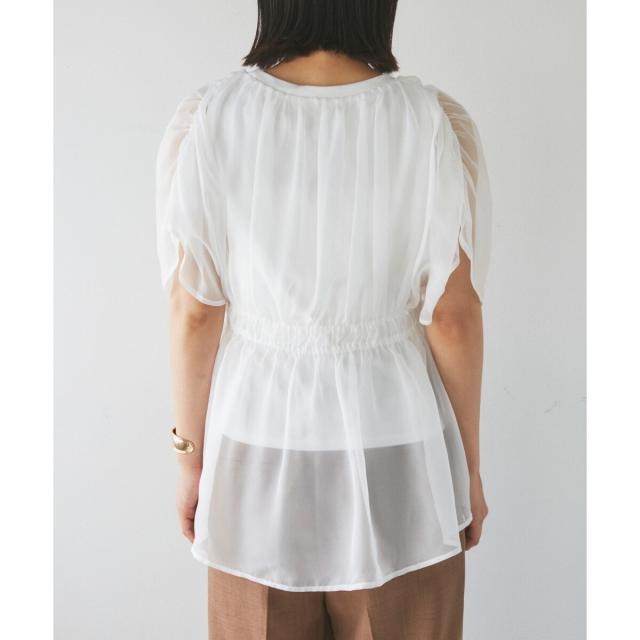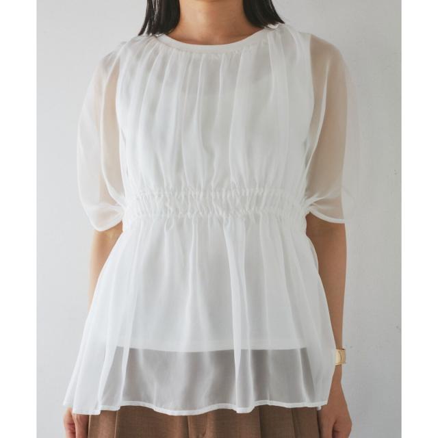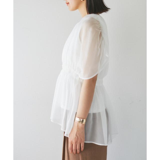 ・異素材使いの透け感でワンランクアップのスタイリング化叶う。隠したい肩回りをしっかりカバーできるのもポイント!