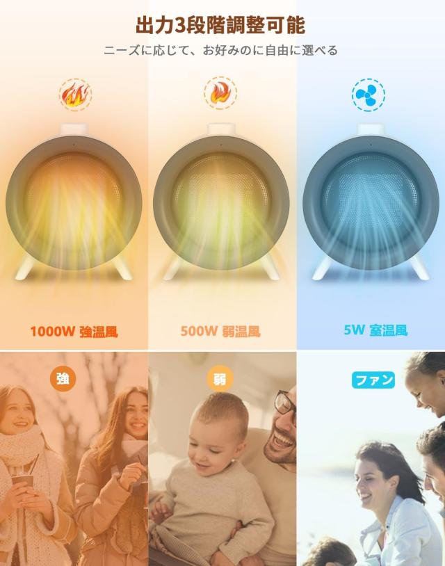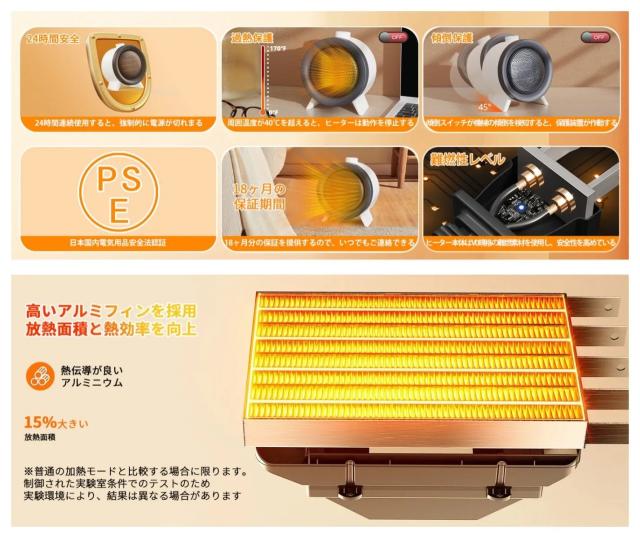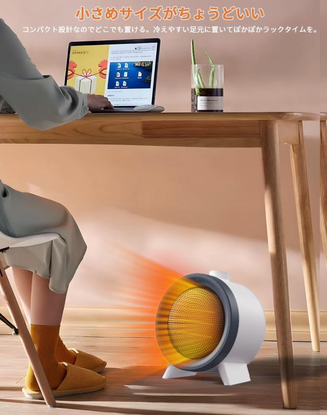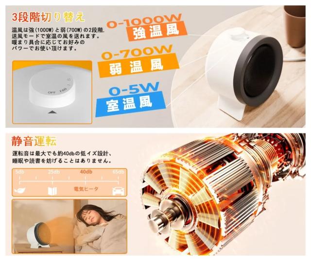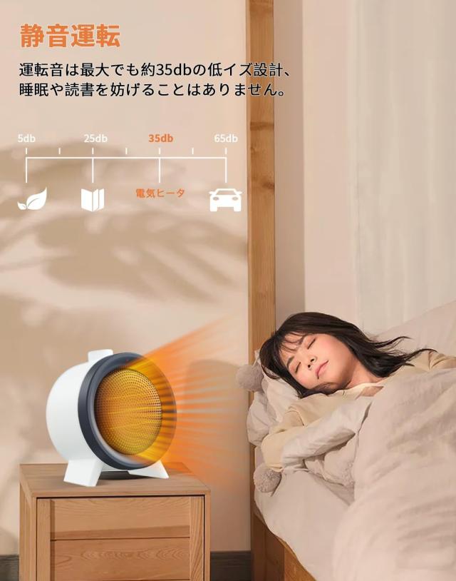 【静音運転】市販品よりも静かな動作音で、当社の試験の結果、ラミックヒーター作動時の騒音は25デシベル以下。オフィス、寝室、子供部屋での使用に適しています。睡眠や仕事の邪魔にならないし、長い目で見れば聴力にも優しい。