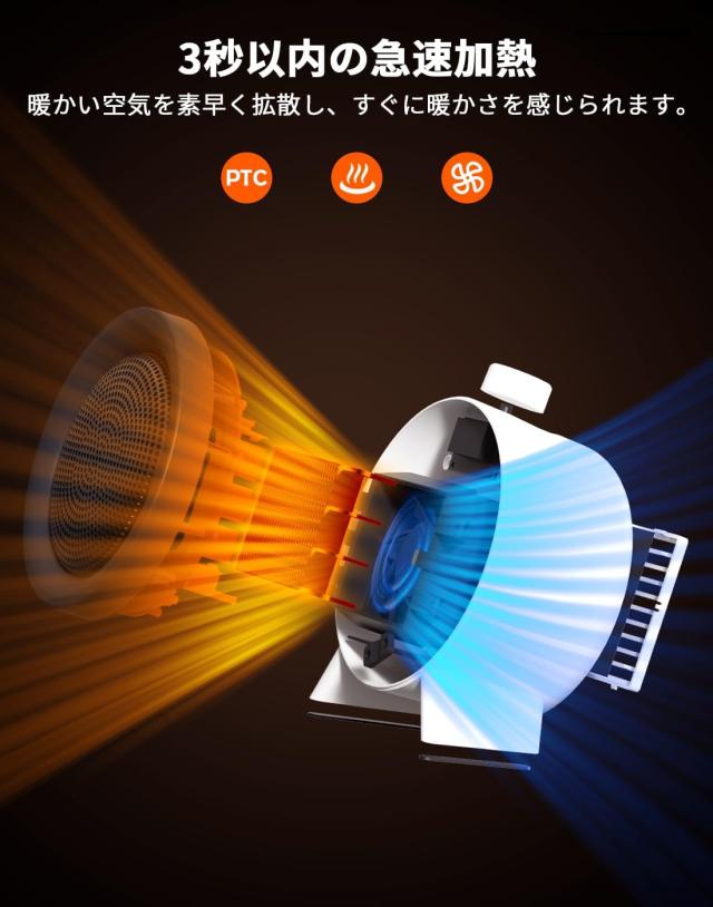 【2秒速暖】高品質のセラミックヒーターパッド内蔵、1000wのハイパワーで、素早く加熱します。室内の6畳を2秒で暖かく感じさせ、10秒で室温を20度以上に上昇させることができます。