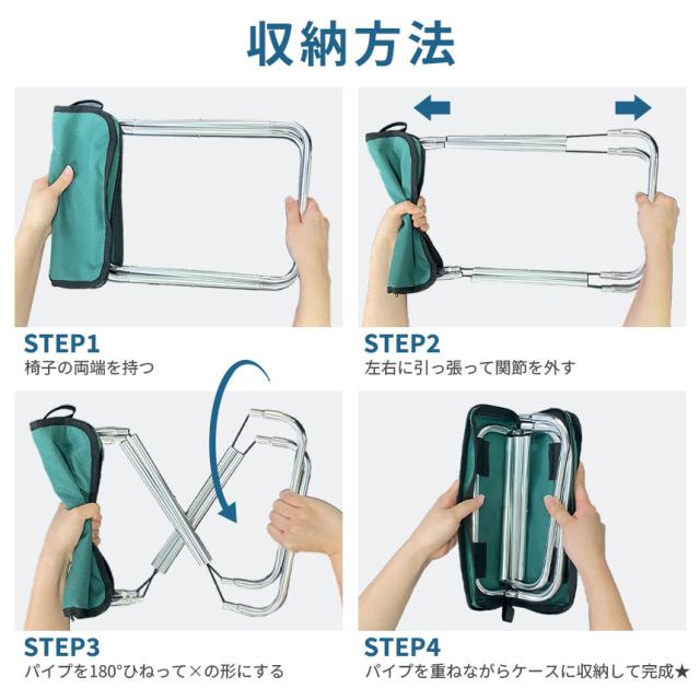 【椅子&収納ケース一体型】椅子の座面がそのまま収納ケースになっていて、本体とは別にケースを用意する必要なし!ファスナーを開けば即座に組み立て可能!使いたいときにすぐ使える!組み立て方法、収納方法は商品説明画像をご確認ください。※椅子のパイプ関節は、強力ゴムで連結されています。手を挟まないようにお気を付けください。
