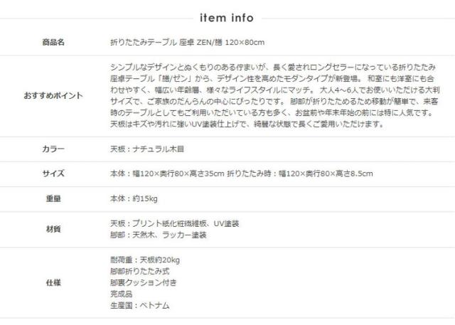 シンプルなデザインとぬくもりのある佇まいが、長く愛されロングセラーになっている折りたたみ座卓テーブル「膳/ゼン」から、デザイン性を高めたモダンタイプが新登場。 和室にも洋室にも合わせやすく、幅広い年齢層、様々なライフスタイルにマッチ。 大人4〜6人でお使いいただける大判サイズで、ご家族のだんらんの中心にぴったりです。 脚部が折りたためるため移動が簡単で、来客時のテーブルとしてもご利用いただいている方も多く、お盆前や年末年始の前には特に人気です。 天板はキズや汚れに強いUV塗装仕上げで、綺麗な状態で長くご使用いただけます。