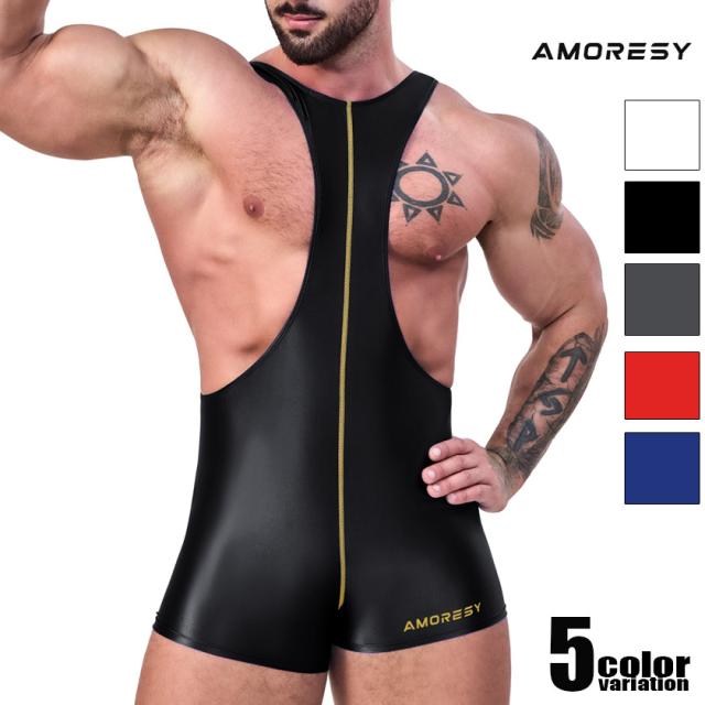 メンズレスリングウェア型インナー AMORESY/アモレシー センターライン レスリングウェア コスチューム Bodybuilder Singlet ストレッチ生地 シングレット 男性下着 メンズ パンツ セクシー ショルダーボクサーパンツ 上下一体型 光沢