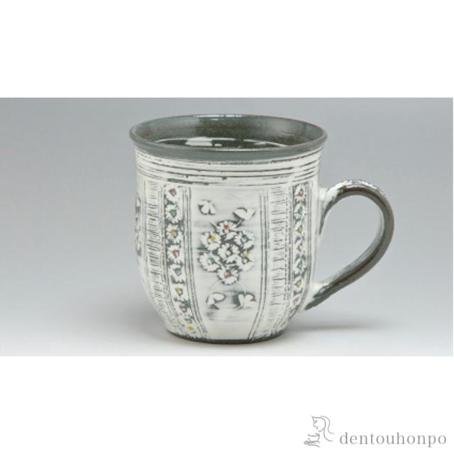 印華紋(花の印を押しあてた紋様)に赤・黄・緑の色絵がアクセントとして見事に調和しています。ぽってりとした愛らしいマグカップです。