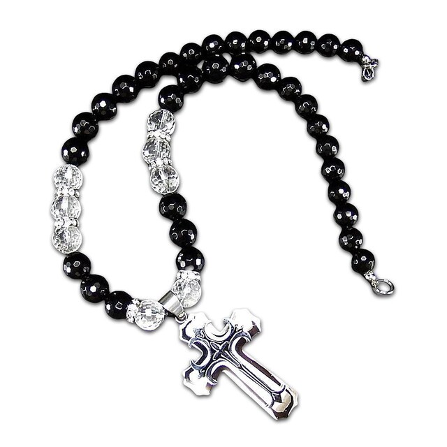 欧風クロスステンレス十字架オニキス水晶12mm天然石ネックレスゴージャスメンズ