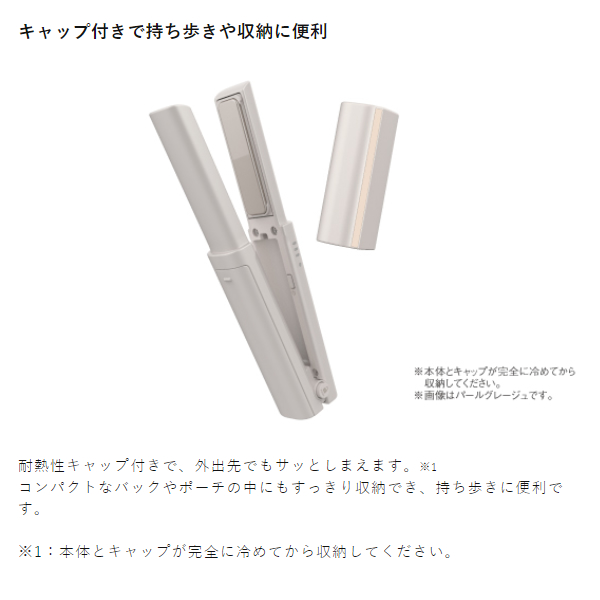 コスメ感覚で持ち歩けるコードレスアイロン。 コードレスながら高温&スピード立ち上げを実現。 いつでもどこでも、自信のあるヘアスタイルへ ■本体寸法: 高さ / 35mm 幅 / 192mm 奥行き / 34mm(キャップ付き、収納時) 高さ / 70mm 幅 / 189mm 奥行き / 34mm(本体のみ、使用時) ■本体質量: 180g(本体のみ) 200g(キャップ付) ■消費電力:ー ■電源:DC5V 2A (充電時) ■スイッチ: スイッチ(電源 ON / OFF / 温度切替〈210℃ / 190℃ / 160℃〉) 開閉ロック OPEN - LOCK ■海外使用:〇 ■カラー/JANコード:-H(メタリックグレー):4975302451019 ※記載は商品仕様の一部です。仕様説明不足等の理由での返品はできません。特に適合等は必ずご確認ください。