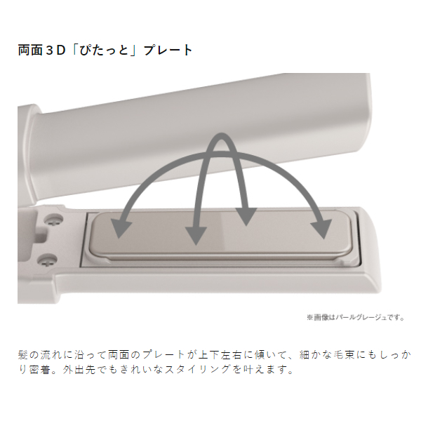 髪の流れに沿って両面のプレートが上下左右に傾いて、細かな毛束にもしっかり密着。外出先でもきれいなスタイリングを叶えます。