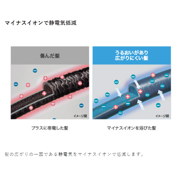 髪の広がりの一因である静電気をマイナスイオンで低減します。