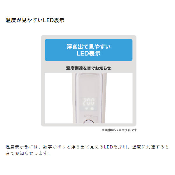 温度表示部には、数字がポッと浮き出て見えるLEDを採用。温度に到達すると音でお知らせします。