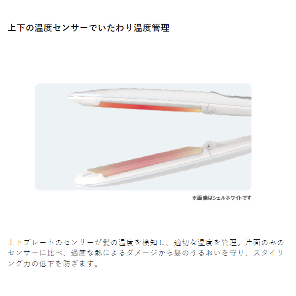 上下プレートのセンサーが髪の温度を検知し、適切な温度を管理。片面のみのセンサーに比べ、過度な熱によるダメージから髪のうるおいを守り、スタイリング力の低下を防ぎます。