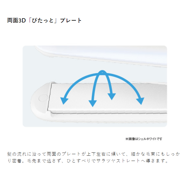 髪の流れに沿って両面のプレートが上下左右に傾いて、細かな毛束にもしっかり密着。毛先まで逃さず、ひとすべりでサラツヤストレートへ導きます。