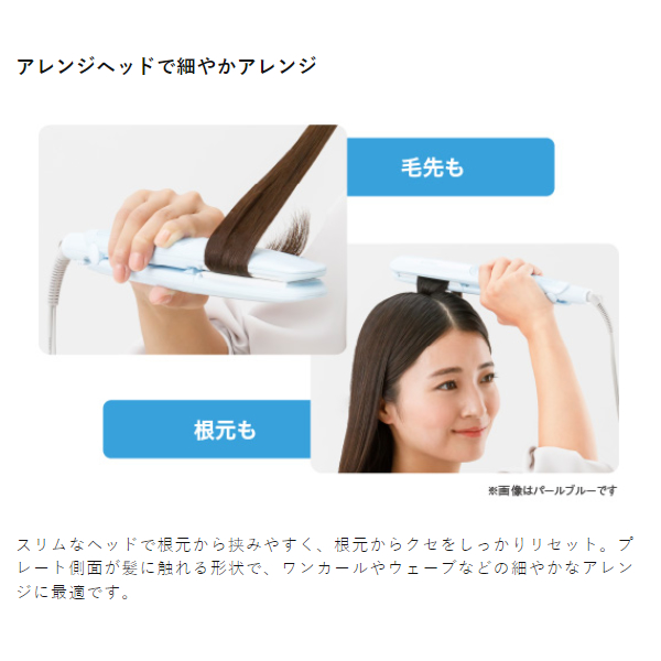 スリムなヘッドで根元から挟みやすく、根元からクセをしっかりリセット。プレート側面が髪に触れる形状で、ワンカールやウェーブなどの細やかなアレンジに最適です。