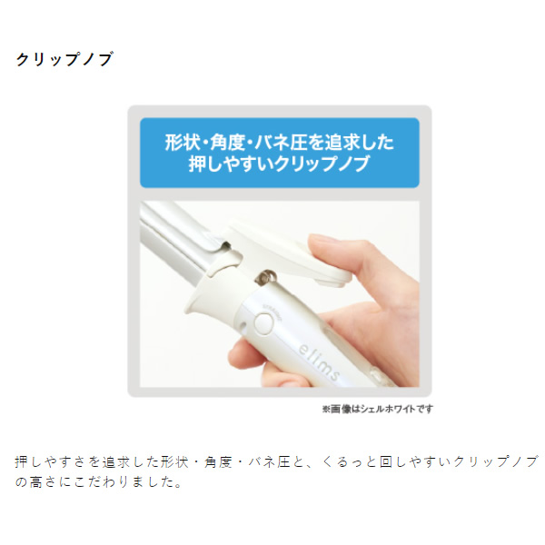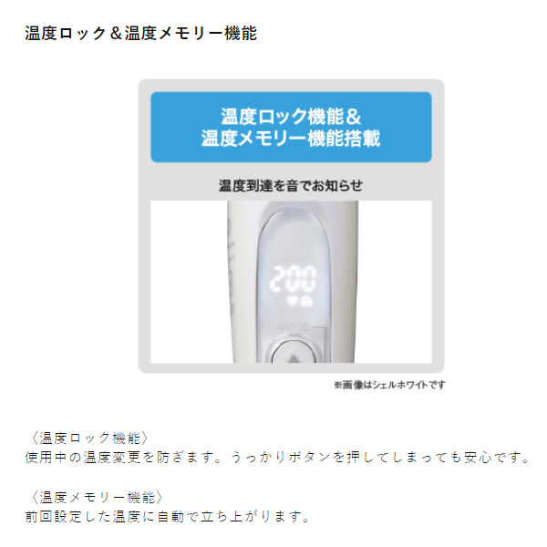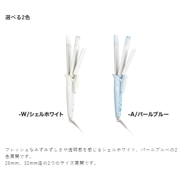 いたわりも、スタイリング力も。 ストレート・カールが1本で叶う2WAY ■本体寸法:高さ / 70mm 幅 / 330mm 奥行き / 35mm(本体のみ) ■本体質量:375g ■消費電力:0-1250W ■電源:AC100-240V 50/60Hz ■スイッチ: ・電源スイッチ:「ON/OFF」 ・温度調節ボタン:「▲/▼」 ・カール/ストレート切替ボタン ■アイロン径:26mm径 ■アタッチメント:クイックコードバンド ■搭載イオン:マイナスイオン ■デジタル温度表示:○ ■温度調節幅:90〜200℃(23段階、5℃刻み) ■ラク抜きプラグ:○ ■海外使用:○ ■スチーム:× ■温度ロック機能:○ ■温度メモリー機能:○ ■自動電源OFF機能:○ ■開閉ロック機能:○ ■カラー/JANコード:-W(シェルホワイト):4975302 455239 ※記載は商品仕様の一部です。仕様説明不足等の理由での返品はできません。特に適合等は必ずご確認ください。