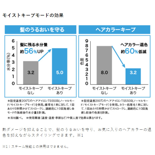 ※3:テスコム調べ。 /IPM1832にて検証。160℃以上の高温に設定した場合の効果。/使用環境(温度・湿度・季節など)や個人差で効果は異なります。 /モイストキープモードとの併用はできません。