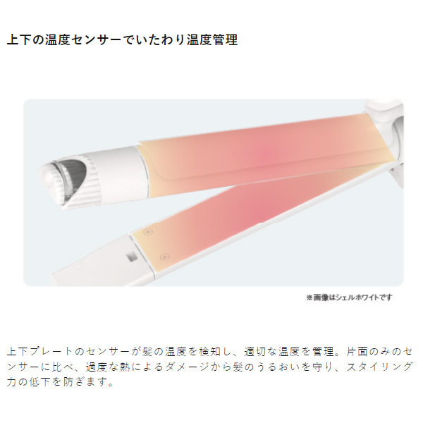 上下プレートのセンサーが髪の温度を検知し、適切な温度を管理。片面のみのセンサーに比べ、過度な熱によるダメージから髪のうるおいを守り、スタイリング力の低下を防ぎます。