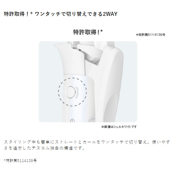 スタイリング中も簡単にストレートとカールをワンタッチで切り替え。使いやすさを追求したテスコム独自の構造です。