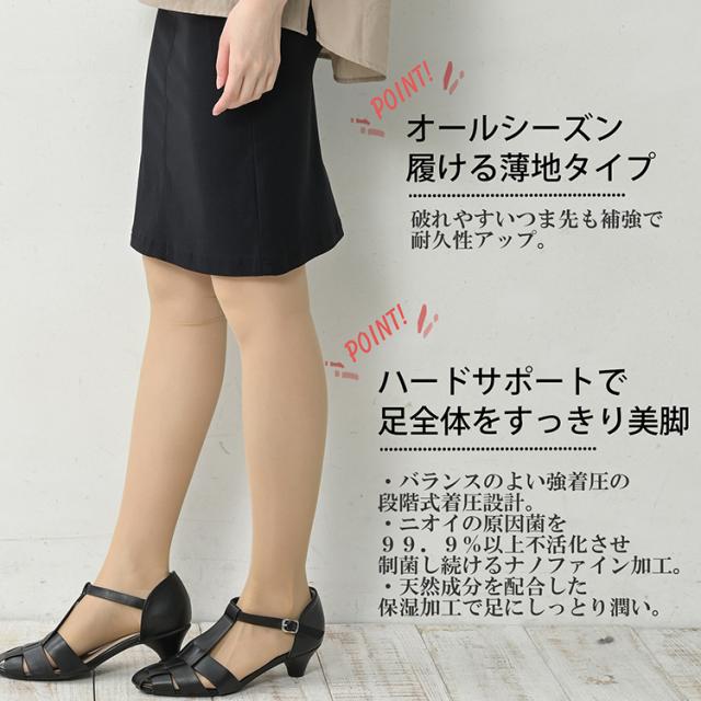 スッキリ引き締め美脚ケア! ハイパワー着圧ストッキング。 防臭ナノファイン加工と保湿加工で 肌に優しく、清潔で衛生的な状態を維持する レッグウェアです。 |
