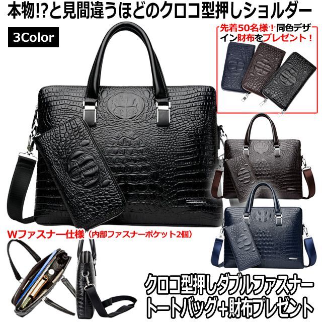 クロコ型押しダブルファスナー トートバッグ+財布プレゼント (Wファスナー ラウンドファスナーロングウォレット付き)