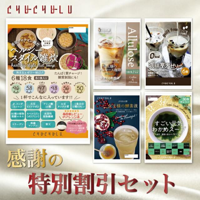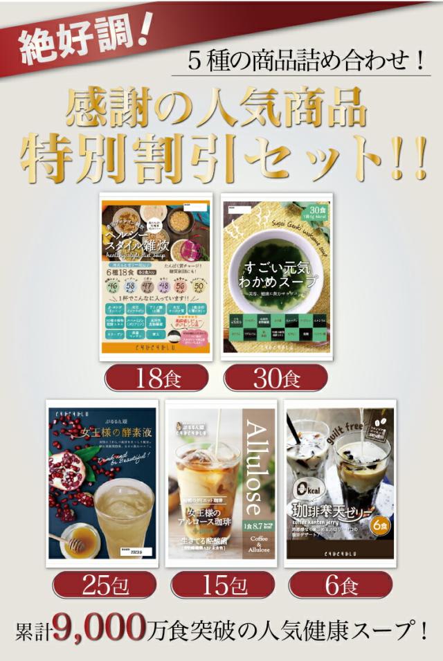 ■内容量:ヘルシースタイル雑炊 6種18食、すごい元気わかめスープ 30食、女王様のアルロース珈琲 15食、珈琲寒天ゼリー 6食、女王様の酵素液 25袋